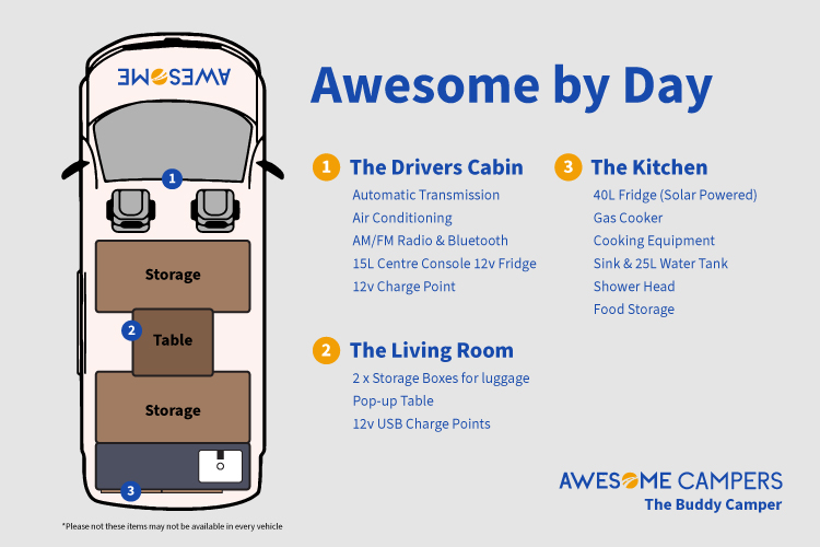 Meet the Awesome Buddy Camper — the fresh faces of the fleet with just enough life experience to be interesting. These Nissan vans have been treated to a full 2024 glow-up, so they feel modern without trying too hard.