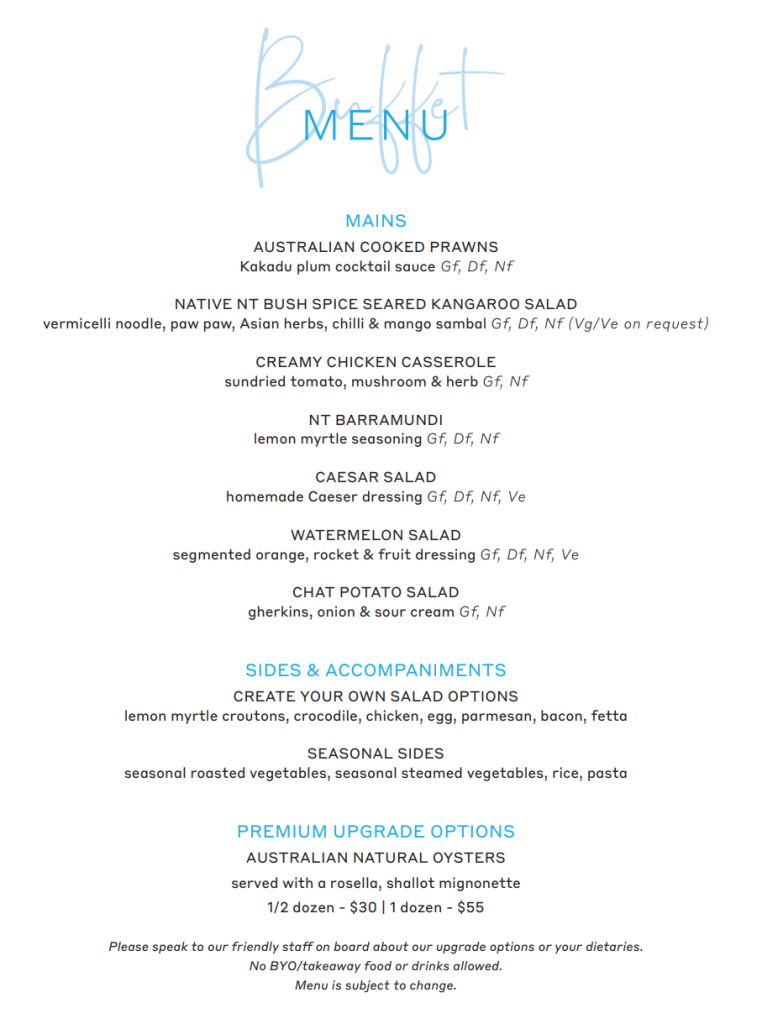 While we do endeavour to accommodate the best for our buffet, we cannot guarantee completely allergen free dishes. This is due to potential trace allergens and cross contamination in the working environment and suppliers and we accept no liability. If you have a serious food allergy, please make your own decision when selecting your dishes to eat. Our crew are on hand to help you make an informed decision on which dish is best for your allergy.