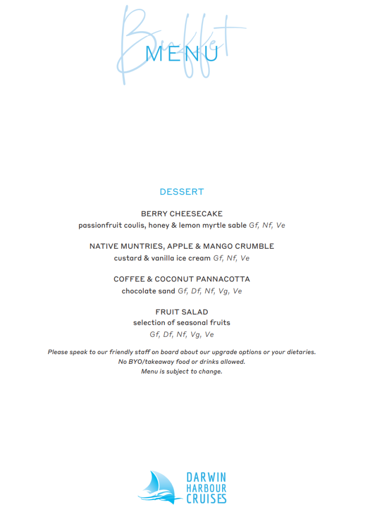 The Charles Darwin Dinner cruise is a buffet. We can cater to all dietary requirements or allergies if we are advised at the time of booking/prior to your cruise.